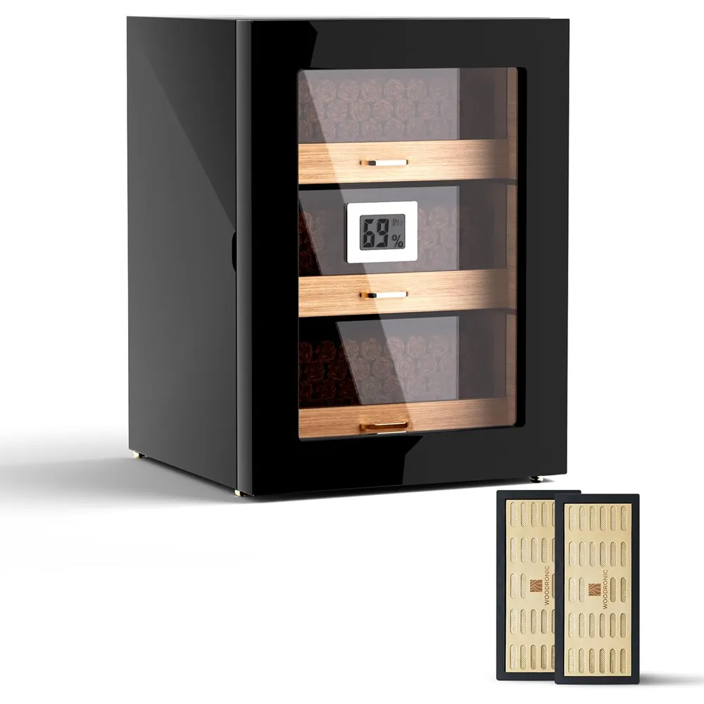 Woodronic Cigar Humidor Cabinet for 150 Counts with Spanish Cedar Lining, Crystal Gel Humidifiers, Digital Hygrometer & Larger Drawers, Polished Piano Black, Desktop Cigar Gift for Fathers