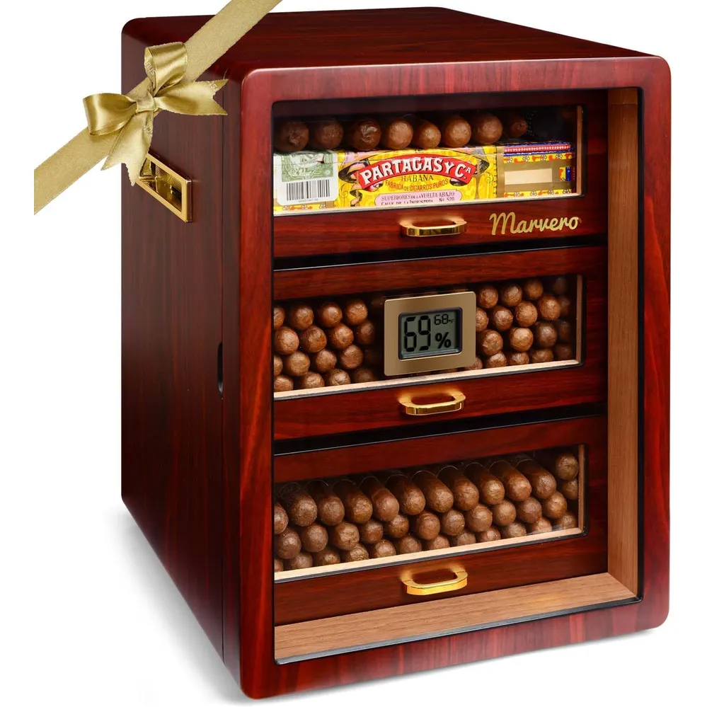 Marvero Cigar Humidors, Cedar Wood Humidor with Digital Hygrometer, Drawers, Humidifiers and Gold-Plated Hardwares. Cigar humidor Cabinet for Men Husband Father, 300 Cigars Capacity Walnut Color