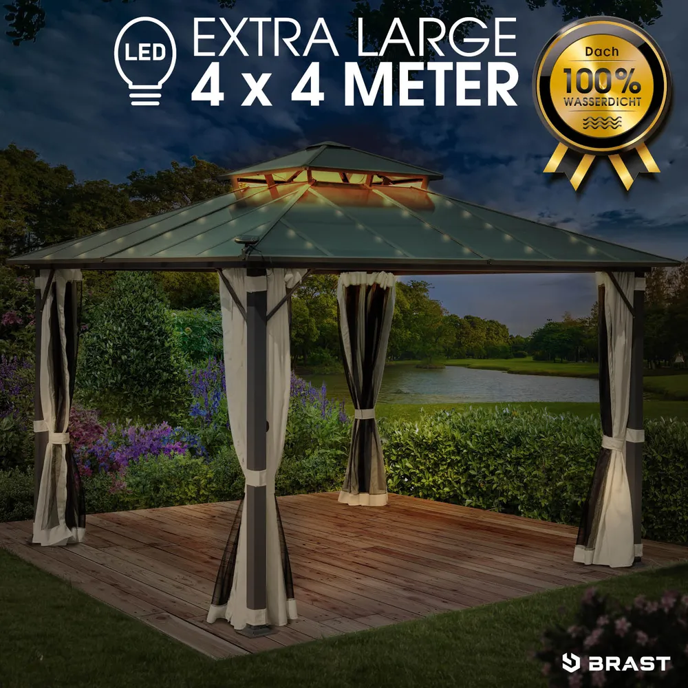BRAST Alu Pavillon PAGODE 4x4m beige mit Moskitonetz & LED-Beleuchtung
