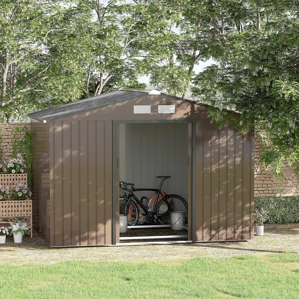 Outsunny 9 x 6ft Garden Metal Storage Shed, Outdoor Storage Tool House with Ventilation Slots, Floor Foundation and Lockable Double Doors, Light Green