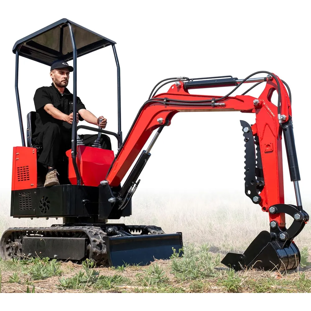 AHM Mini Excavator, 1 Ton Mini Digger with Hammer Auger Log Grapple Quick Hitch Grading Bucket & Rake Included, 13.5 hp Small Crawler Machine with Rain Canopy for Home Garden Farm Park Roadway Digging