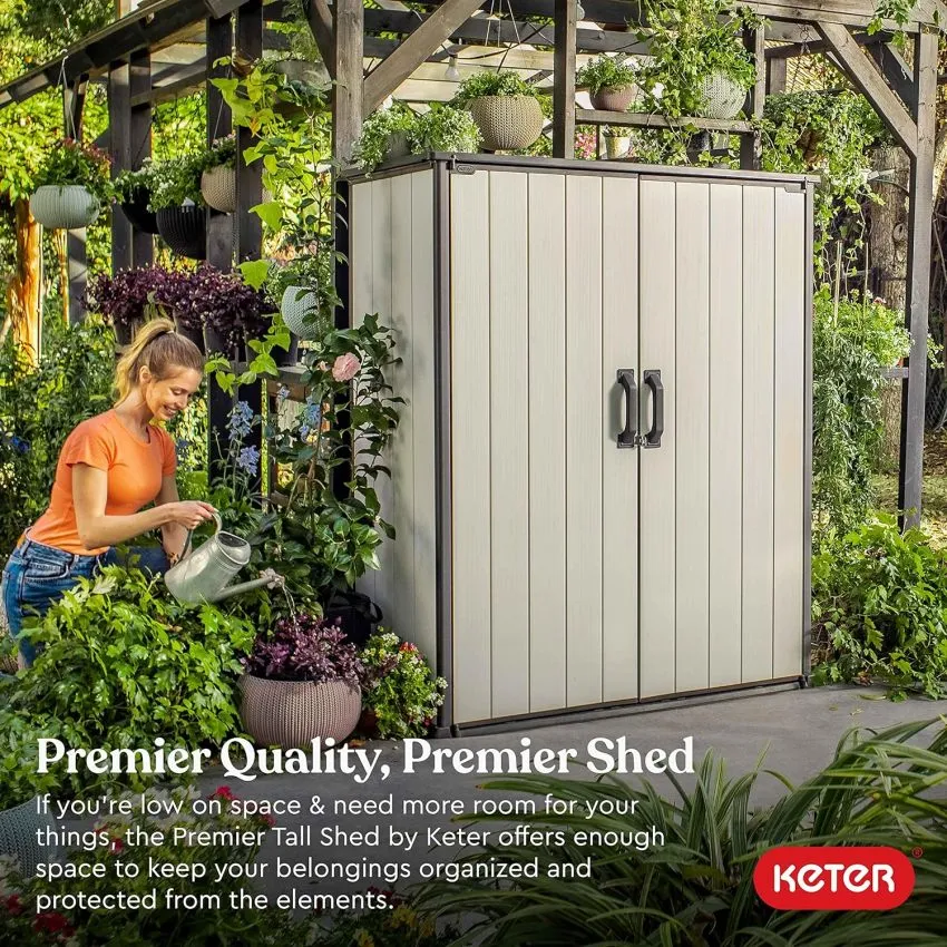 Keter Premier Tall 4.6 x 5.6 ft. Resin Outdoor Storage Shed with Shelving Brackets for Patio Furniture, Pool Accessories, and Bikes, Grey & Black