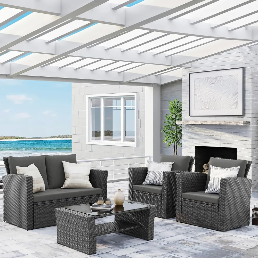 Wisteria Lane 4 Piece Outdoor Patio Furniture Sets, Wicker Conversation Set for Porch Deck, Grey Rattan Sofa Chair with Cushion