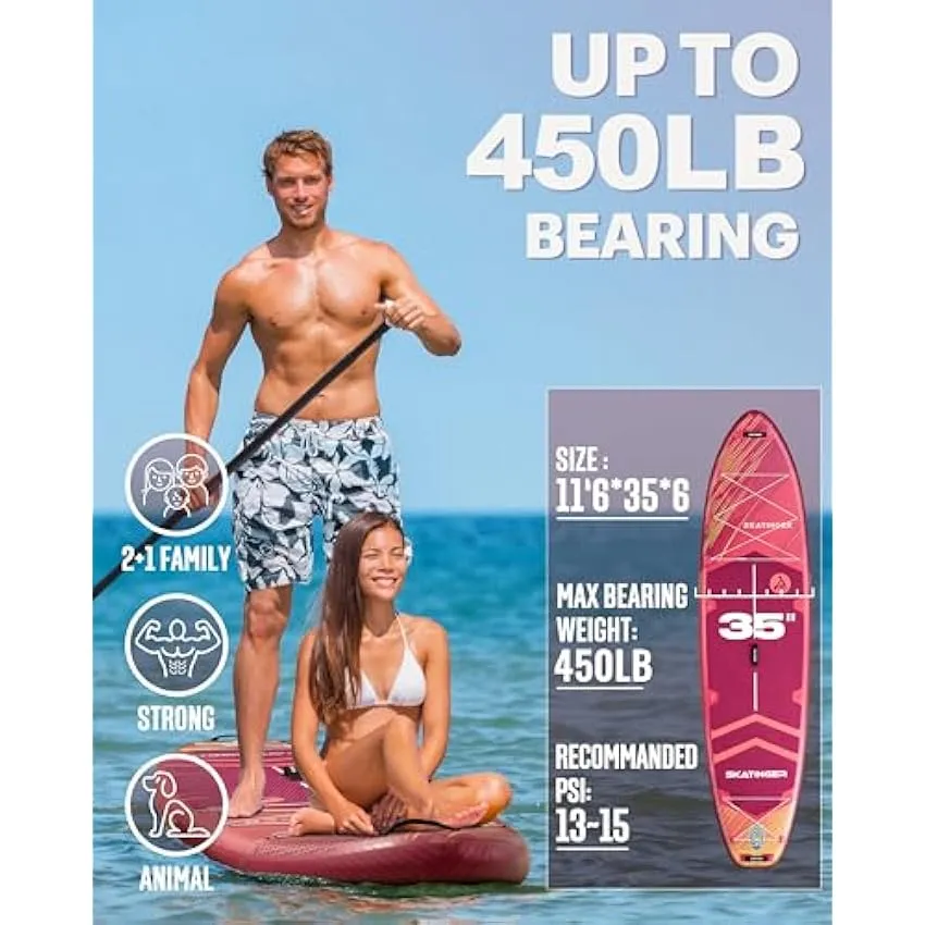 - 【𝟰𝟱𝟬𝗟𝗕 𝗪𝗘𝗜𝗚𝗛𝗧 𝗖𝗔𝗣𝗔𝗖𝗜𝗧𝗬 𝗙𝗢𝗥 𝗠𝗨𝗟𝗧𝗜𝗣𝗟𝗘 𝗥𝗜𝗗𝗘𝗥𝗦】Skatinger inflatable paddle board is designed to accommodate solo riders, pairs, or multiple full-figured individuals, supporting up to 450 lbs without compromising balance or speed when overloaded, ideal for families or groups.