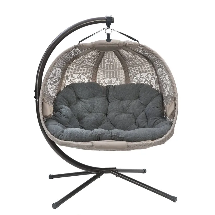 Kick back and relax in modern style with this 2-person porch swing. Crafted from a metal outer frame, it features an egg-shaped bench hanging from a J-shaped cantilever stand on splayed legs. We love that it’s wrapped in sheer polyester fabric that lets the light through just a little, while an included cushion with generous filling and deep tufting lets you lounge and relax in comfort. The seat measures 50” wide and supports up to 400 lbs., just right for two people (or just one, if you don’t want to share). Best of all, it’s UV-resistant, so it holds its own in the outdoors.