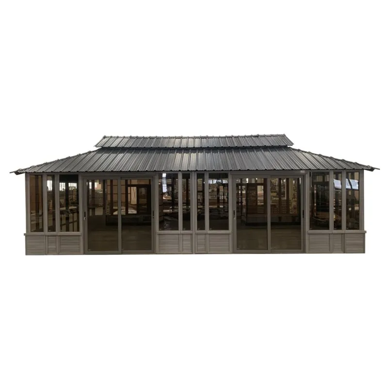 DescriptionThis is a beautifully designed multi-functional building. This is our largest building made from Ultrawood. This flagship building has oversized windows to let in a lot of light and to provide excellent views. The is large and can easily be used to house a swim spa or in-ground swimming pool, and can be used as an outdoor recreational room or a banquet hall. This building includes a two-tier Duraflex PC roof reinforced truss supports, sliding tempered glass lockable windows. There are three entrances, one French double door entrance made of heavy-duty aluminum and tempered glass, and two sliding door entrances. The sketch shows the main double swing French door entrance on the front side and both sliding door entrances on the left side of the building. However, the door entrances are the same dimensions as the window wall sections therefore they can be placed in any position and the installer can decide at the time of installation. For example, you can put the double swing French door entrance on the side and put the sliding doors in any position where there is a window wall section. A screen kit upgrade can be added to the building at the time of order for a small additional fee. The screens can cover all the window openings and slide on a separate track independently from the window thus providing the user with ultimate flexibility to have windows closed, windows open with screens, or windows and screens both open and the same time.