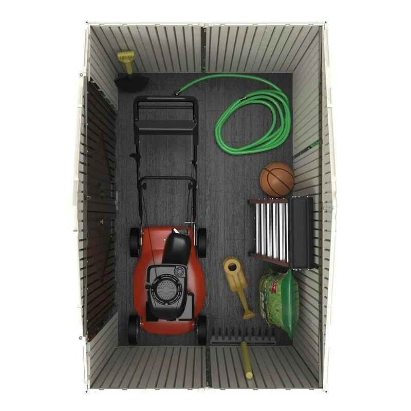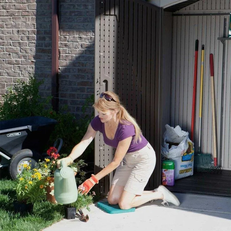 This compact shed is ideal for a driveway or carport where there is limited space. Keep tools and automotive supplies handy, safe, and secure in this highly durable, low maintenance Lifetime shed. Constructed from UV-protected, high-density, double-walled polyethylene plastic with steel reinforcements. Won’t rust or dent like metal sheds. Won’t fade, crack, or splinter like wooden sheds. This shed comes to a full-length skylight that provides natural interior lighting. The steeply pitched roof allows for quick drainage of rain and snow, and the shorter roof span allows a greater snow load capacity than our larger sheds. Double-wide doors allow for easy access. Keep your tools and automotive supplies organized and located right where you need them in the driveway