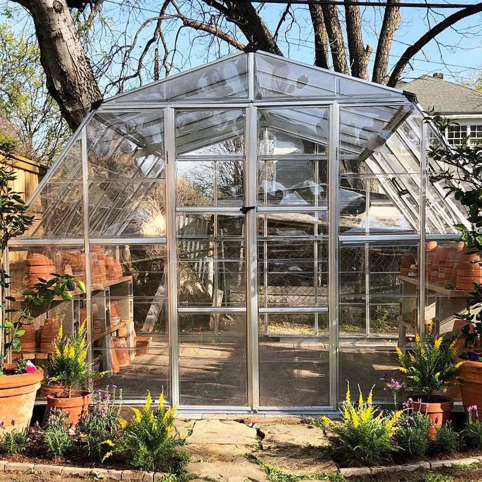 Designed with twin-wall roof panels and crystal-clear side panels provides a precise balance for your plants, protecting them from direct overhead sunlight and retaining heat while allowing 90% light transmission to nourish your garden. With double, swinging doors and two vent windows you’ll have abundant air flow to create a comfortable environment. This hobby greenhouse features a reinforced, rust-resistant aluminum frame, galvanized steel base, and low threshold for easy wheelbarrow access.