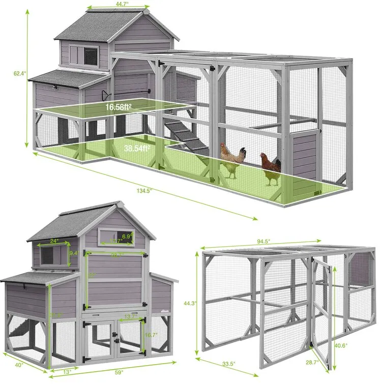 Product TypeChicken CoopNumber of Levels2 LevelsNesting Box IncludedYes Chicken Run IncludedYes Pull-out Tray IncludedYes Roosting Bar IncludedYes Wire Mesh IncludedYes Wheels / Casters IncludedNo Ramp IncludedYes Doors IncludedYes Window(s) IncludedYes Locking System IncludedYes VentsYes Weather ResistantYes ImportedYes DurabilityWater ResistantWhat’s IncludedChicken Run Included; Door Included; Roof Included; Ramp IncludedNesting Box MaterialWoodChicken Capacity8FinishGrayWood TypeSolid WoodRoof ColorGrayAssembly