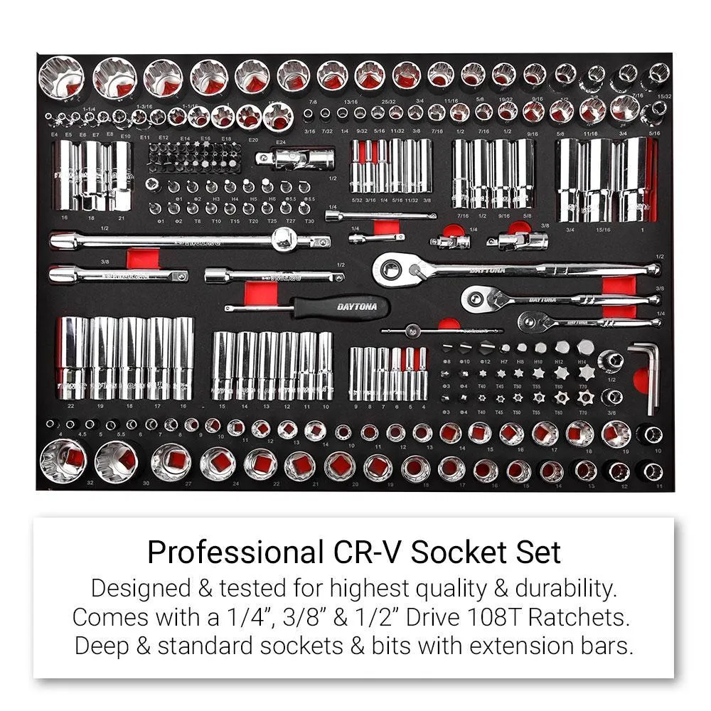 - 3x 108T ratchets (1/4″, 3/8″, 1/2″) + extension bars, universal joints, sliding T-bars