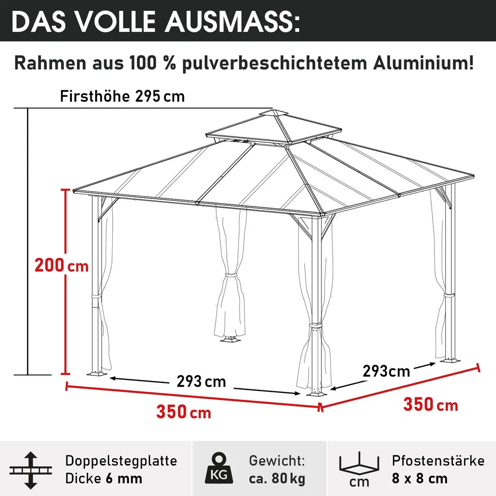 Unser Aluminium Pavillon 3.5 x 3.5m schützt Sie vor Sonne. Wind und Regen mit einem besonders robusten Hardtop Dach aus getöntem Polycarbonat: