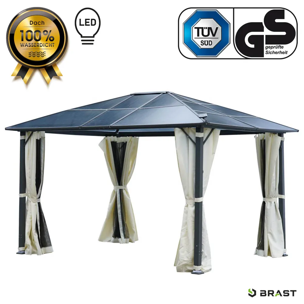 Unser BRAST Alu-Pavillon mit LED-Beleuchtung wurde vom TÜV eingehend geprüft und mit dem Siegel „Geprüfte Sicherheit“ ausgezeichnet: