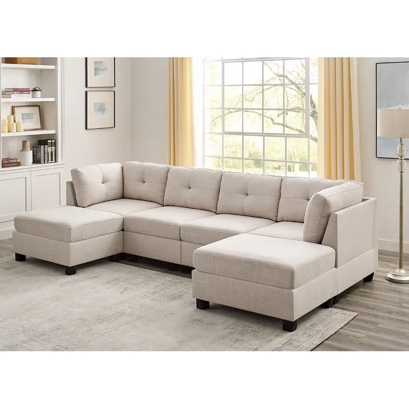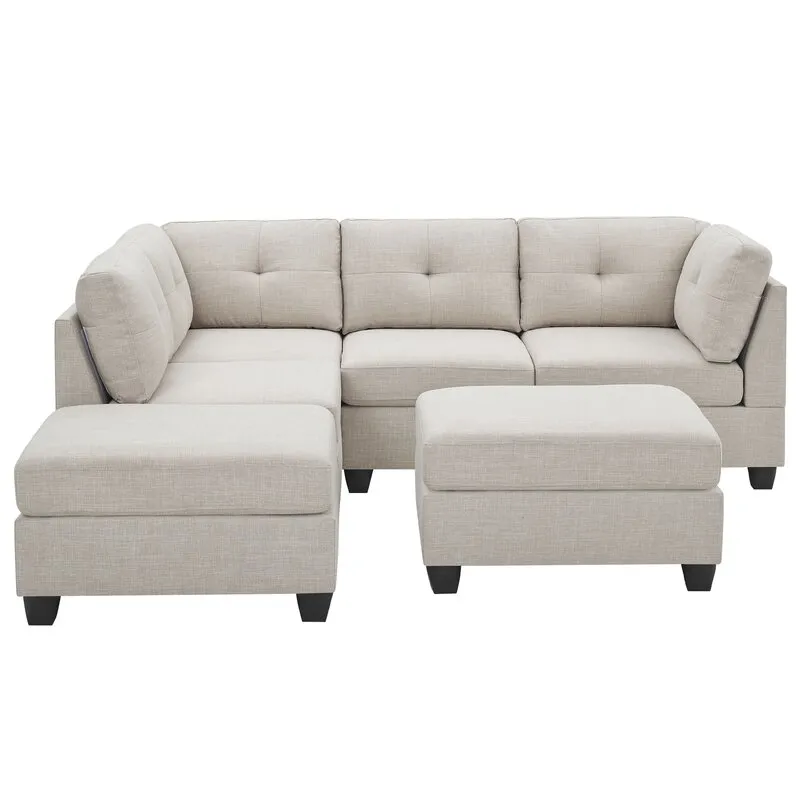 This modular sectional gives you the flexibility to create the ideal seating arrangement for your space. It comes with two ottomans and four sofa sections that connect to each other with metal brackets. This couch is made from engineered wood and stands on black block legs.