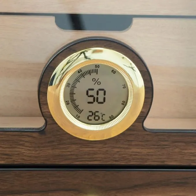 - Spanish Cedar Inside – Smart, Scented Humidity: Known for its rich aroma and moisture magic, Spanish cedar holds more humidity than regular wood and keeps your cigars aging gracefully at 65–70% RH with a touch of natural fragrance.