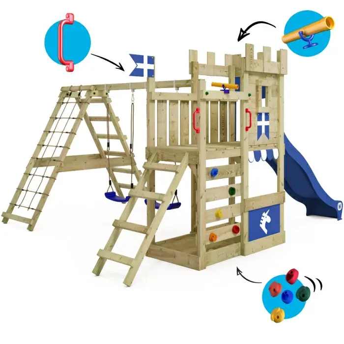 Our DragonFlyer climbing frame is especially popular with families because it provides a variety of features that encourage your kids to play creatively. It’s not just on the double swing and slide (incl. water connection) where your children can burn off energy together with their friends. The climbing extension in particular supports the development of their dexterity and balance. The sandpit and high-quality accessories turn it into the ideal overall package. And with the climbing frame’s crenelated castle walls, the DragonFlyer will take your kids on unforgettable adventures in the world of knights and castles.