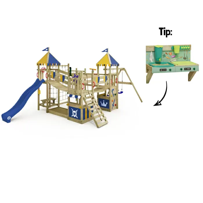 Our majestic Smart King children’s climbing frame is the ideal addition to your garden to encourage creative play. It combines versatile play elements that provide unforgettable childhood memories linked to the world of princesses, castles, and knights. Your children can sit together with their friends at the integrated picnic table or let off steam on the climbing extension. The Smart King has several platforms and towers as well as a balance beam that connects them. Here, little adventurers can develop their balance. The large sandpit is perfect for digging and building, while the authentic suspension bridge opens the door to endless fantasy worlds for your children.