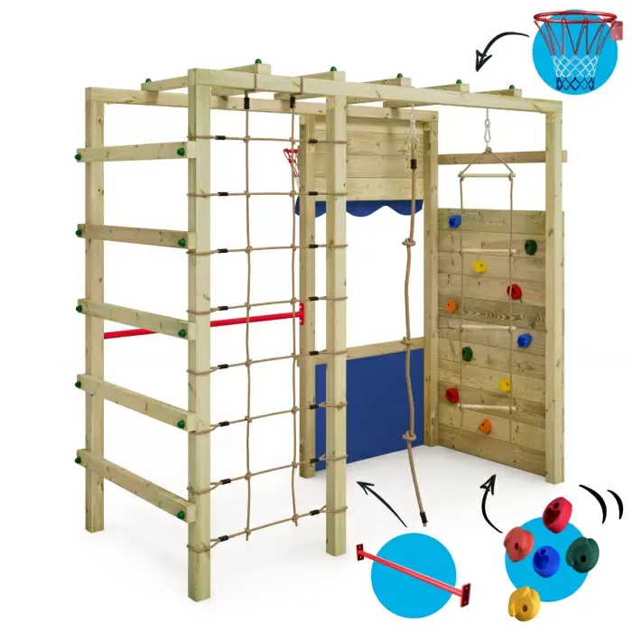 The compact Smart Action climbing frame is especially popular among families with smaller gardens, offering your little ones versatile options for outdoor fun. The basketball hoop is great for ball games and your kids can clamber about on the horizontal bar to their heart’s content. Together with their friends, they can climb the large climbing wall and climbing net or test their dexterity on the rung ladder or climbing rope. The monkey bars encourage your kids’ coordination skills and make the Smart Action the perfect option for endless fun.