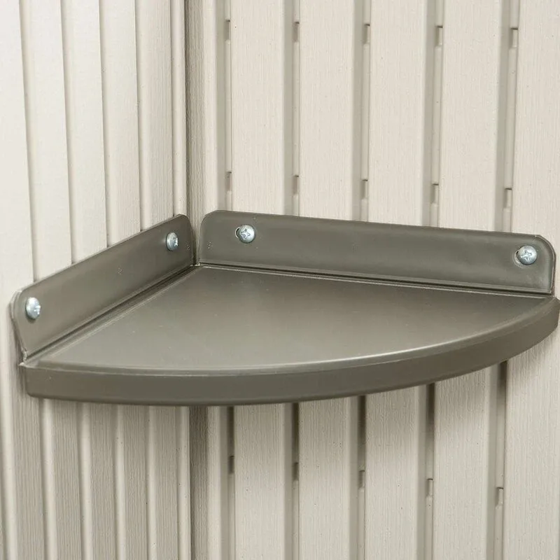 The dual entry 14′ 7.5″ wide x 7′ 8.7″ deep plastic storage shed provides the perfect storage space for all your tools. This double entryway is the perfect addition to your outdoor space and keeps your tools organized. Lifetime’s Double Entry 14′ 7.5″ W x 7′ 8.7″ DD Plastic Storage Shed is constructed of steel, HDPE polyethylene plastic to provide years of reliable use. A gable roof adds traditional style to a garden shed. The tool shed’s desert tan and dark brown finish gives it a classic look and enhances its overall appearance. It consists of two polycarbonate windows with blinds, double doors, two shelves, four corner shelves, two nail strips with tool hooks. Screened vents provide airflow and keep the shed pest-free. High-density non-slip plastic flooring provides excellent stability and easier access to tools. It’s waterproof and weatherproof to withstand most weather conditions. A storage shed is quick and easy to assemble. Easy to care for, wipe with dry or damp cloth to keep clean. This storage shed is made in the USA.