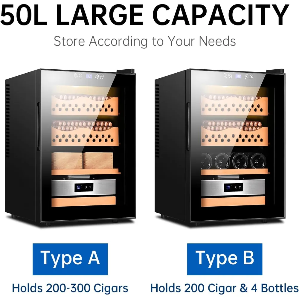 - Cigar Cabinet Capacity: 50L capacity, can hold roughly 200 cigars. Equipped with 2 horizontal dividers and 1 drawer, you can assemble and match the cedar shelves to your preference and needs.