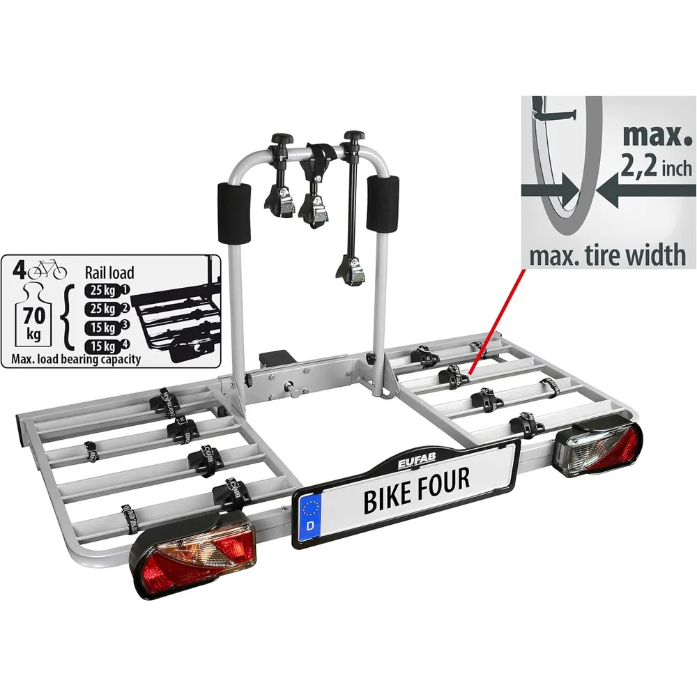 Manufacturer EUFAB Brand EUFAB Model Eufab 11437 Bike Four bicycle carrier Item Weight 20 Kilograms Product Dimensions 140 x 140 x 74 cm; 20 kg Item model number 11437 Manufacturer part number 11437