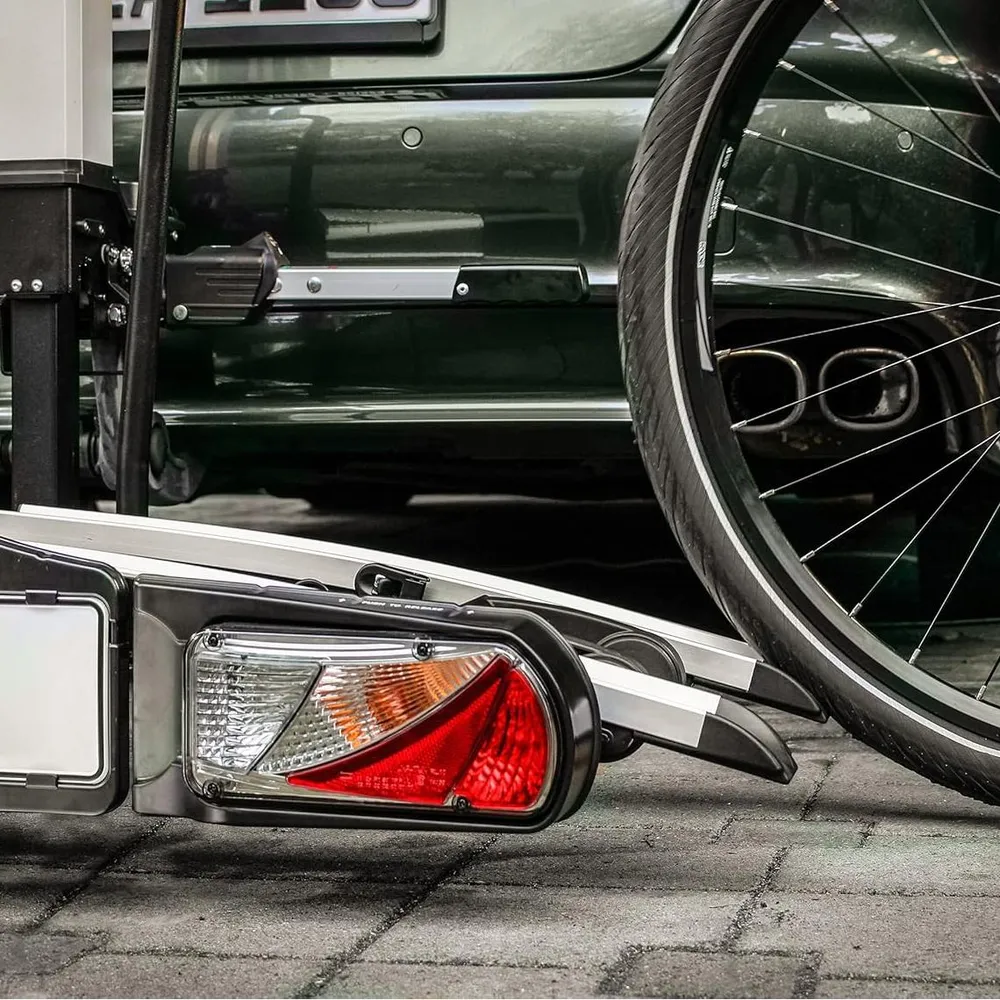 Also suitable for bicycles with oversize and Y-frame up to 6 cm in diameter. Electric drive for lowering and lifting the carrier. Simplifies the loading of the bicycles, especially with heavy e-bikes. Folding mechanism with additional safety mechanism usually allows the boot to be opened with mounted bicycles. With adjustable license plate holder. Can be used in just 5 steps. Rollable by wheels on the bottom. Less fuel consumption compared to transportation. The roof with protective cover.