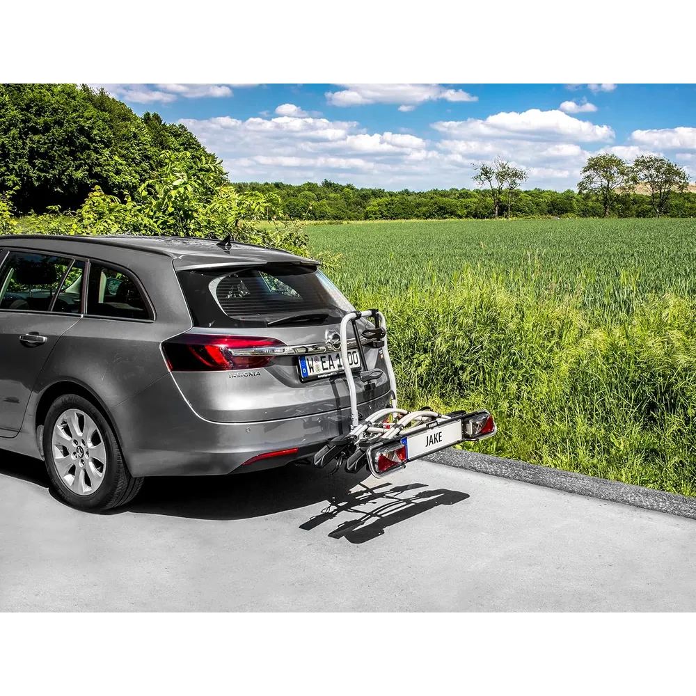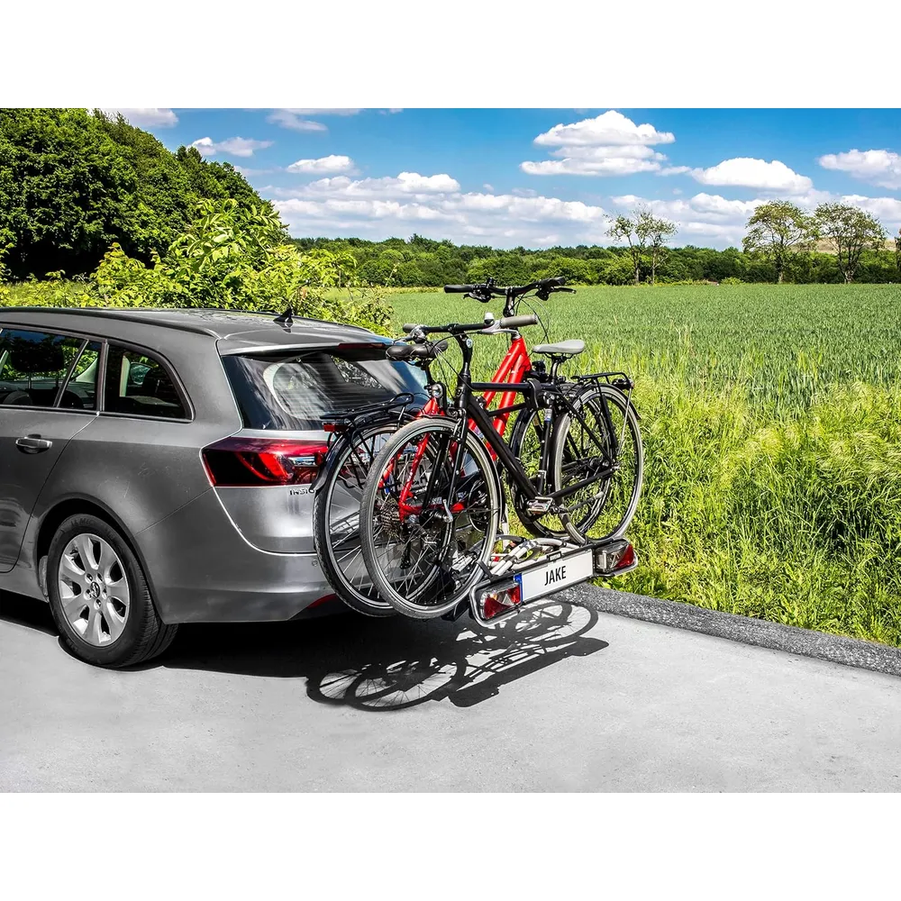 Also suitable for bicycles with oversize and Y-frame up to 6 cm in diameter. Suitable for almost all trailer hitch types. Folding mechanism with additional safety device usually allows the boot to be opened with mounted bicycles. Less fuel consumption compared to transport on the roof loading rail for bicycles and electric bicycles as an accessory, item no. 11512, see page 31.