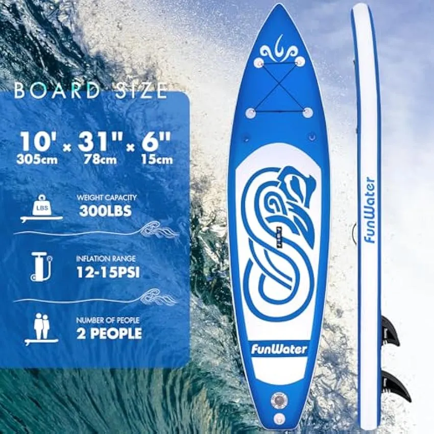 - 【Design and Use】Funwater’s unique ergonomic handle design allows you to inflate your paddle more easily in a shorter time. The sensitive barometer ensures that you can read the sup inflation pressure value (12-15psi) at any time. The multifunctional elastic string can tightly fix any objects placed on the inflatable paddleboard. The multipurpose and ultra-large backpack can help you easily carry the paddle to any of your dream places.