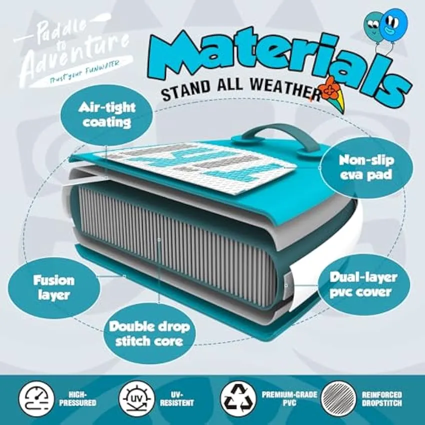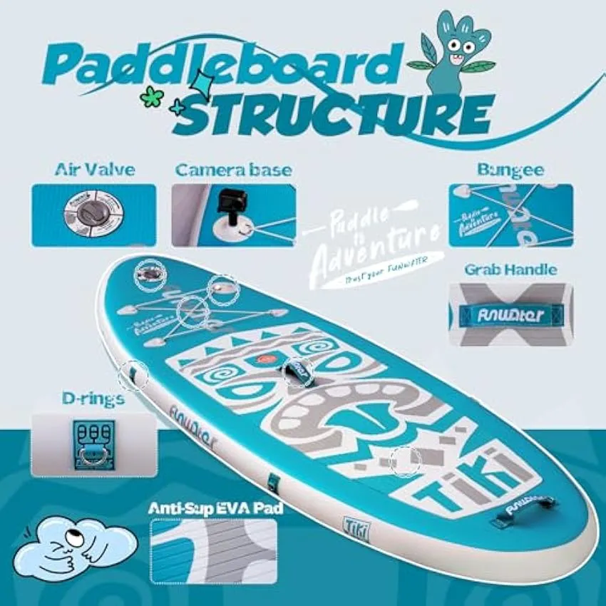 - 【Suitable for Children】FunWater paddle board is made of highly durable PVC core material, which has good impact resistance and wear resistance. The non-slip EVA pad in the middle part of the paddleboard increases the friction between the feet and the board surface, which is more stable and safer for children. The curved linear cushion design can also provide children with extremely high stability in water sports.