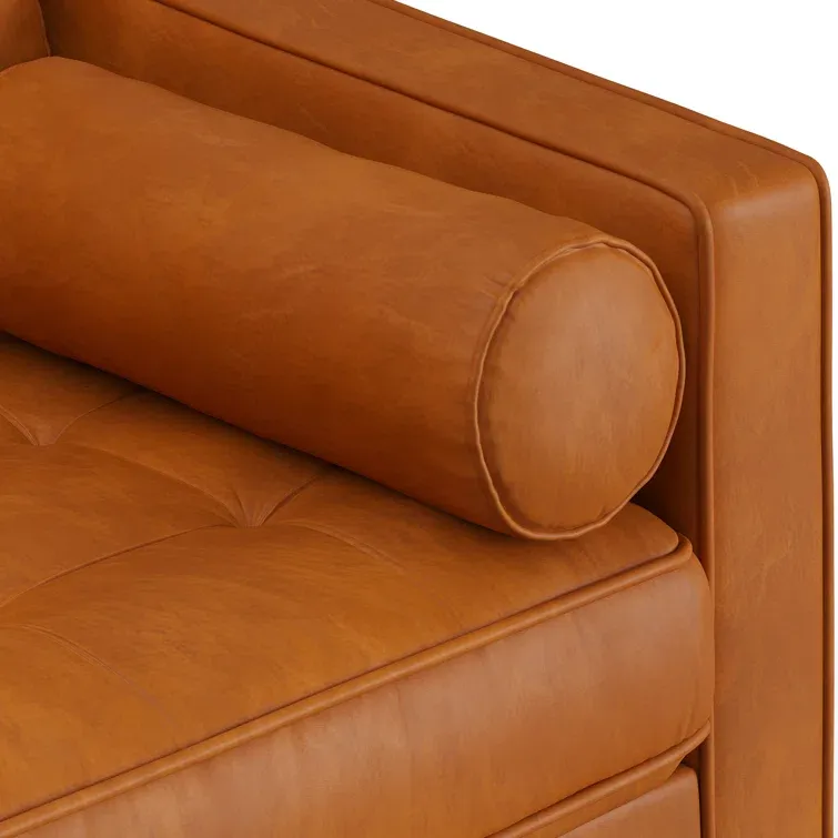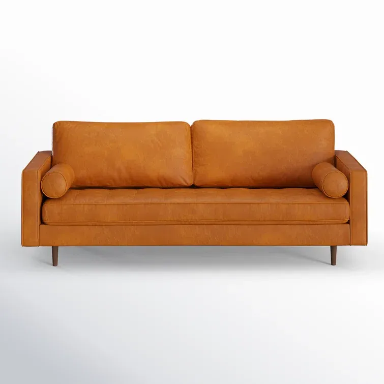 Featuring clean lines and a distinctive silhouette, this sofa is a great way to add mid-century flair to your living room. It has a solid wood frame that rests on four tapered dowel legs. Plus, this couch is wrapped in genuine leather for a sleek modern vibe. The tufted bench seat cushion is also filled with foam over sinuous springs for plenty of support as you lounge. Bonus: Two bolster pillows are included for another layer of comfort.