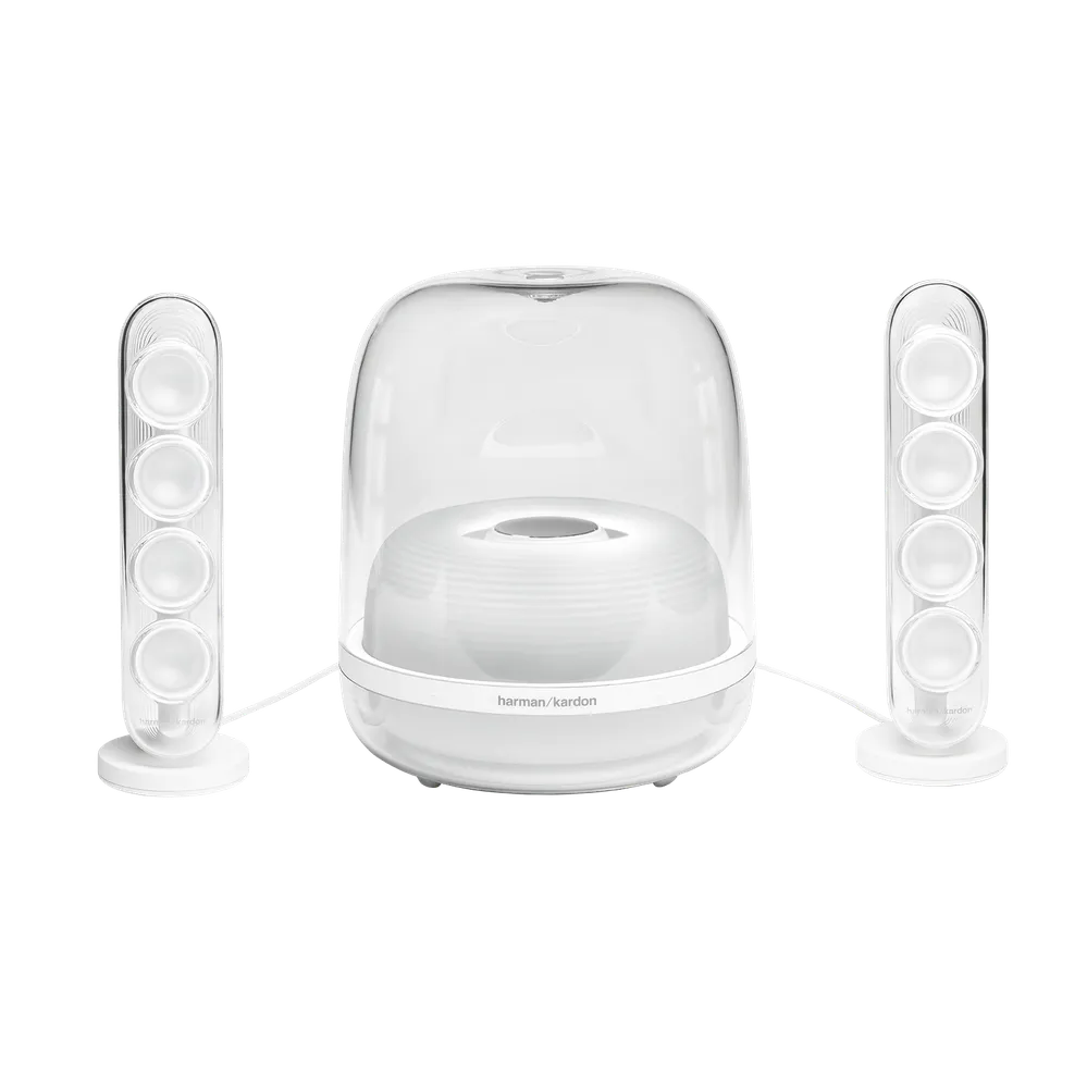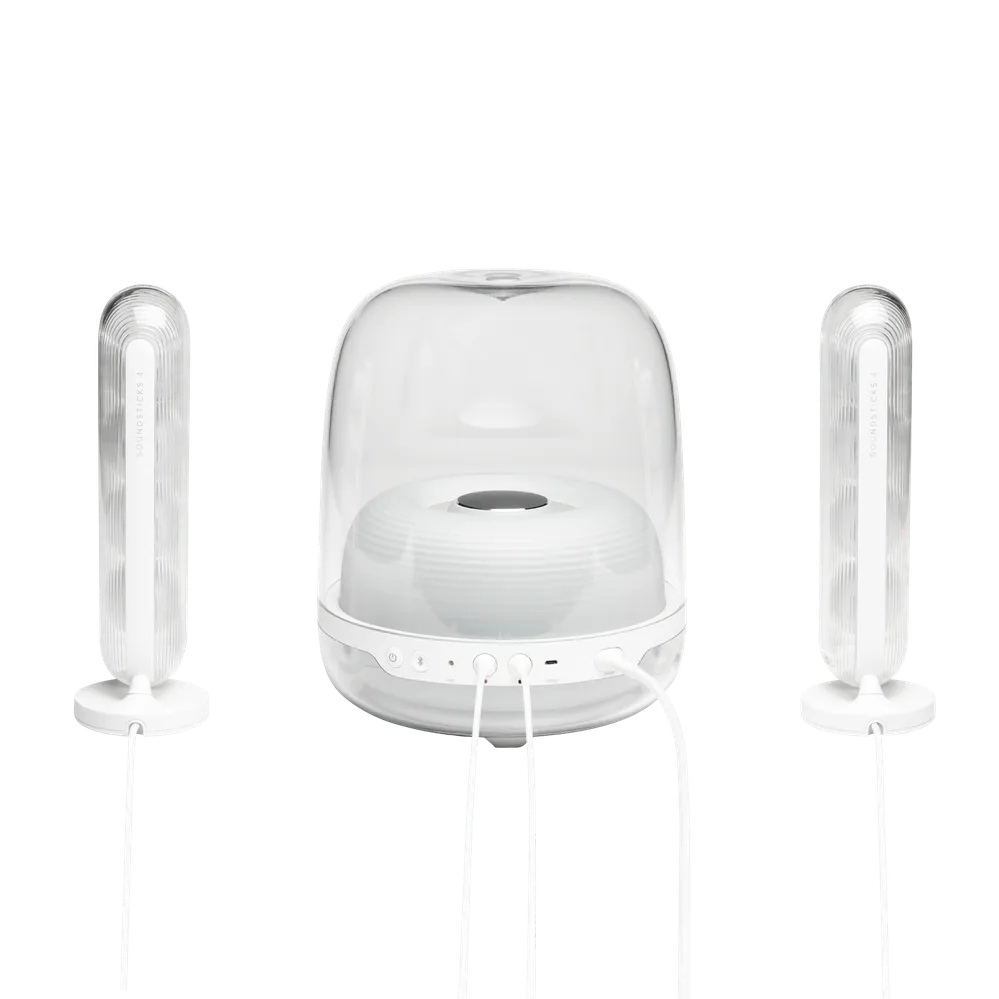Harman Kardon SoundSticks 4 make a statement in any contemporary home. The groundbreaking transparent dome design and sleek silhouette blend in seamlessly with your decor. The two satellite speakers and subwoofer cover look stunning with an inner rippled surface design reflecting the beauty of music.