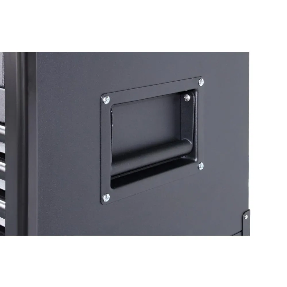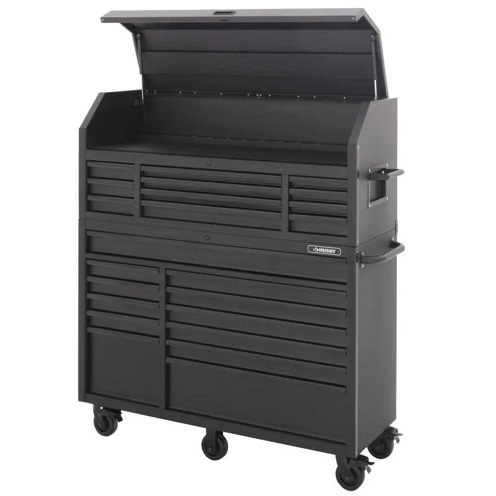 The Husky 56 in. W, 22 in. D with 23 drawers Tool Chest and Cabinet Set is a heavy duty, 18-Gauge steel, tool storage unit that is rated for 3,000 lb. loading capacity. This tool chest and cabinet set with 23 drawers provide 42,930 cu. in. of storage. The heavy duty drawers are rated to 120 lbs. each. The extra deep bottom drawers have double 120 lb. glides. The full length drawer provides convenient storage for longer items, and the small drawers keep smaller items in a confined space. Drawer liners are included to protect and keep your tools in place. The built in full length power strip includes 8 outlets and 2 USB ports, making it easy to keep all of your tools charged. Also included is a rechargeable magnetic LED work light. This light charges via a USB connection, has 3 light modes, a recessed folding hook, and produces up to 360 Lumens. For added security, both the chest and cabinet are fitted with a barrel key lock system. This toolbox weighs in at 542 lbs. so the 5 in. x 2 in. heavy duty industrial grade glides with easy locking pedals are needed to smoothly role this unit around your work area.