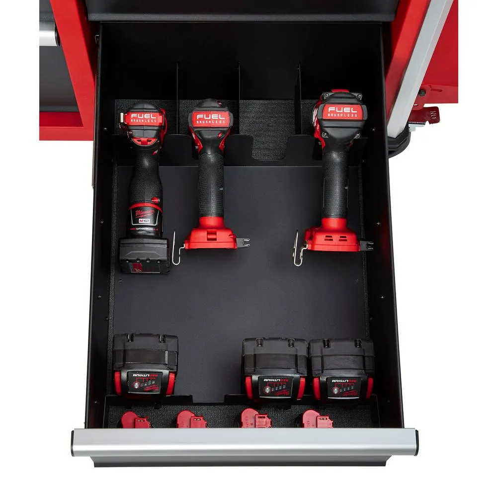 The next generation of Milwaukee high capacity steel tool storage is here. Loaded with features, the Milwaukee High Capacity 56 in. 18-Drawer tool chest and cabinet combo boasts a massive 43,612 cu. in. of storage capacity and can hold over 3,000 lbs. The 18-drawer combo is an extra-deep 22 in., which is 4 in. D than most other units. The 150 lbs. rated, soft-close, ball bearing drawer slides gently retain the drawers from accidental opening or slamming shut. The chest has an extensive list of features including an integrated peg wall in the chest, paper towel holder, 2 J-hooks to store your hoses and cords, and stylish aluminum edge guards with rubber corner bumpers to help protect your investment. There is also an innovative pullout work surface drawer and security drawer which can be locked separately from the rest of the drawers. Additional features within the cabinet include a long tool holder, folding side shelf, bottle opener, and stylish aluminum edge guards with rubber corner bumpers to help protect your investment. There are 2 full-width, top drawers to provide storage for all your long tools and pry bars. Integrated power strips, each with 6 outlets and 2 USB ports, are in the top till and outside wall of the cabinet. The 9.5 in. D bottom cabinet drawers offer additional organizational options with a removable power tool organizer. Lastly, the combo is equipped with Digital Locks, which means there is no need for additional keys in your pocket.