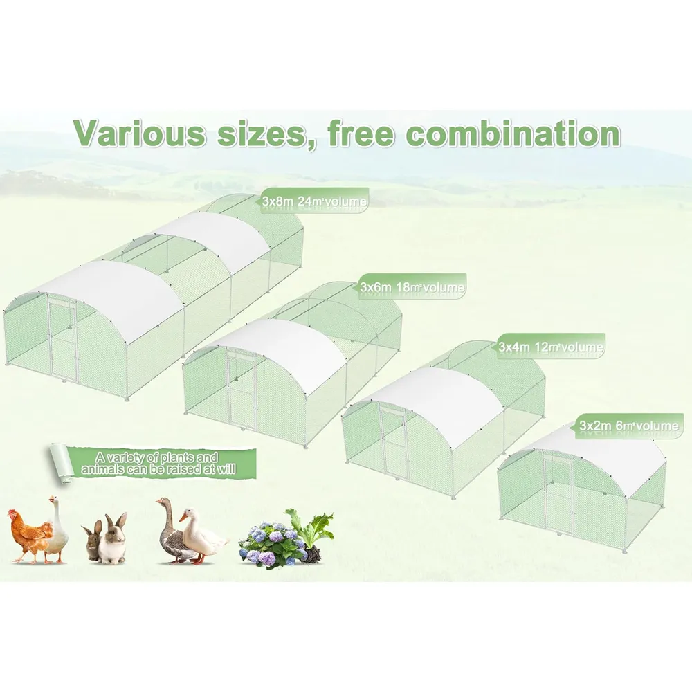 Sorgen Sie für ein sicheres und komfortables Zuhause für Ihre Hühner, Enten, Kaninchen und andere Kleintiere mit unserem bogenförmigen Hühnerstall! Das robuste Design mit PE-beschichteter Abdeckung schützt zuverlässig vor Sonne, Regen und anderen Witterungseinflüssen. Das bogenförmige Dach verhindert die Ansammlung von Wasser oder Schnee, was den Stall besonders langlebig und pflegeleicht macht. Der verzinkte Stahlrahmen und die stabile Konstruktion bieten Sicherheit bei Wind und Wetter, während die abschließbare Tür den einfachen Zugang zum Füttern und Reinigen ermöglicht. Ideal für den ganzjährigen Einsatz im Garten oder auf dem Bauernhof!