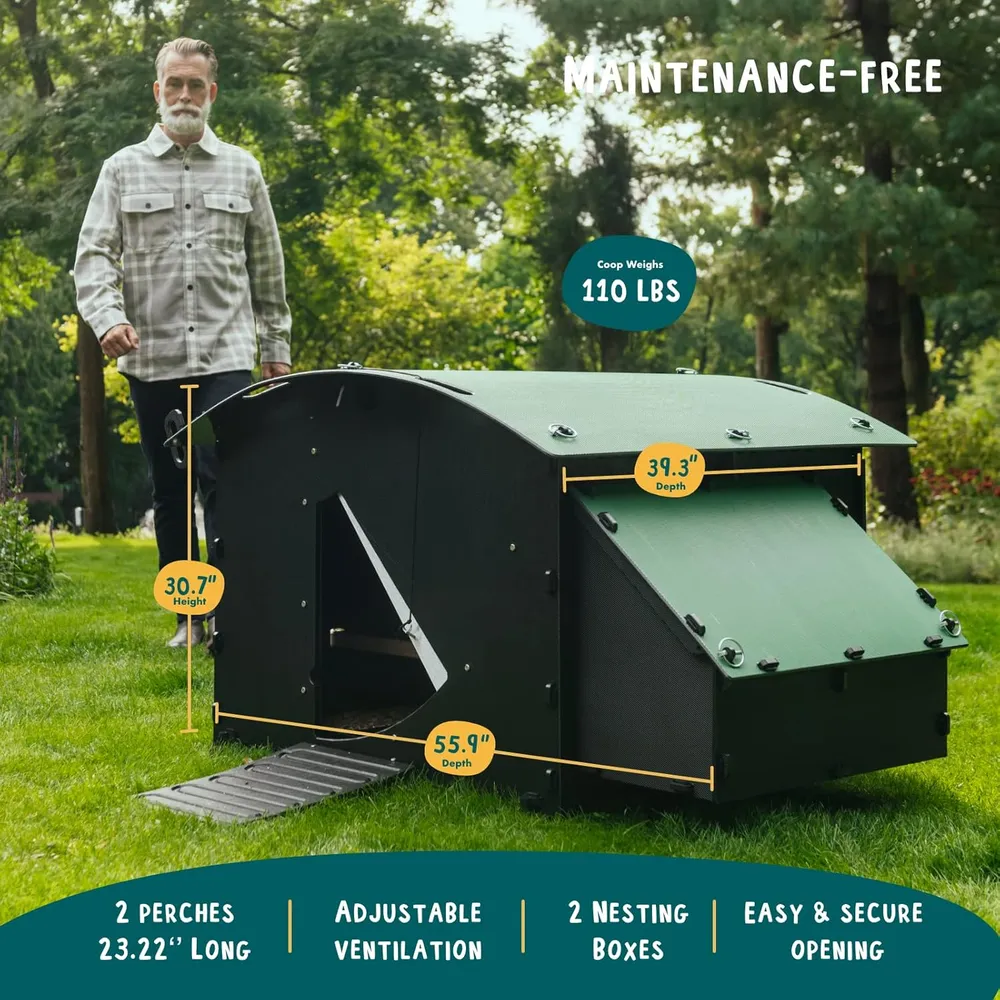 - EINFACH ZU REINIGEN UND ZU BEWEGEN – Dank der glatten Oberflächen im Inneren lässt sich der Nestera Hühnerstall schnell reinigen. Hartnäckiger Schmutz oder Kot kann leicht mit einer Bürste entfernt werden. Das Design ermöglicht es, den Stall in wenigen Minuten zu demontieren und für eine gründliche Reinigung wieder zusammenzusetzen. Im Gegensatz zu Holz trocknen die Nestera Ställe schnell. Dies kann im Winter einen großen Unterschied ausmachen, wenn Holz mehrere Stunden zum Trocknen braucht.