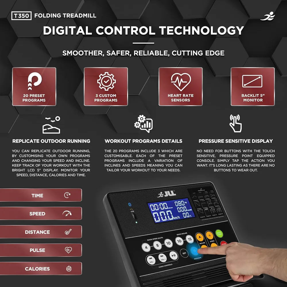 - 【Comprehensive 5-Inch LCD Monitor】 Track your workout metrics with the clear 5-inch LCD monitor, displaying time, speed, distance, heart rate, and calories. Choose from 20 running programs, including 3 customisable options, to tailor your workouts to your specific fitness goals.