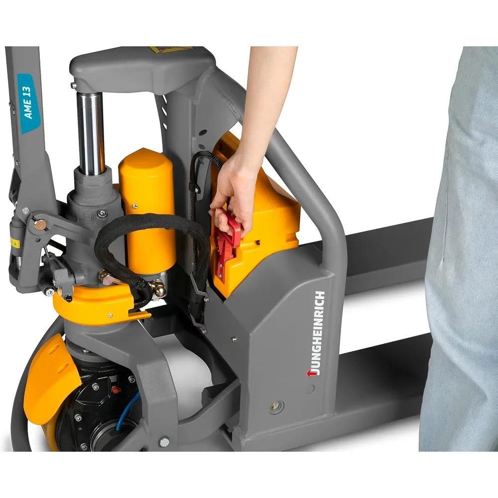 - Stable and curve-safe: the Jungheinrich AME 13 electronic pallet truck is ideal for taking with you in the truck. 2 stabilisers on the castor ensure stable handling