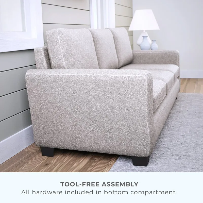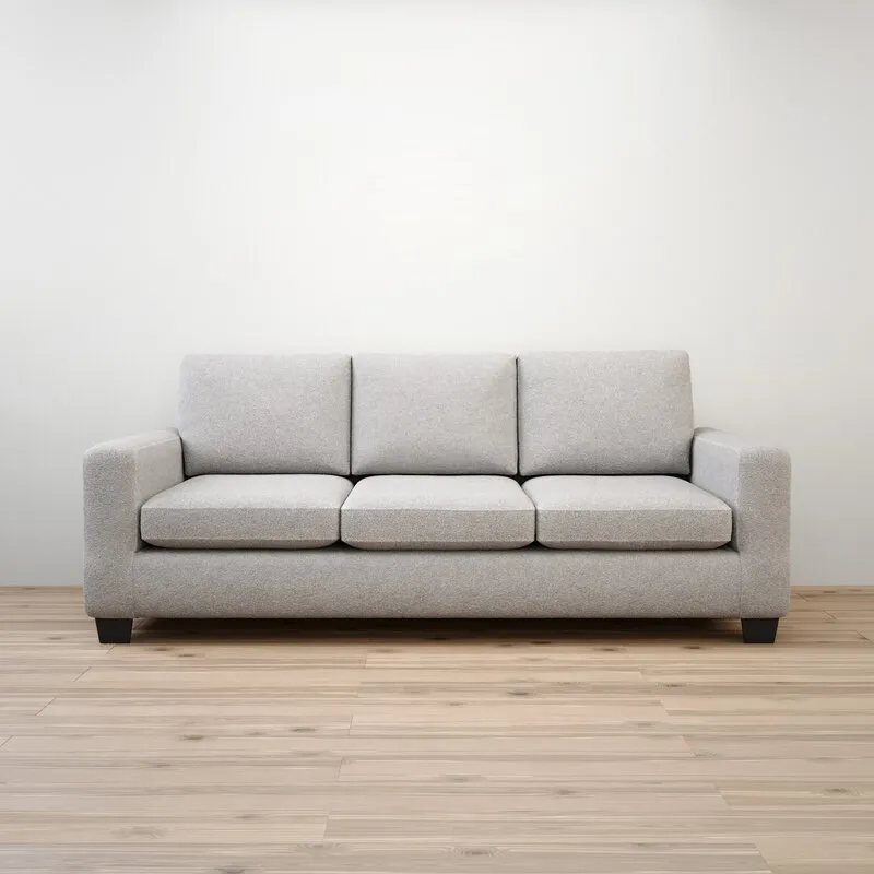 This 83″ sofa has a classic design that adds a modern touch to your living or family room. It has a solid and engineered wood frame with rubberwood legs. Simple track arms allow this sofa to fit into compact spaces and corners to maximize the space in your living room. This sofa has polyester upholstery with fiber-wrapped foam cushions and polyfill pillow backs
