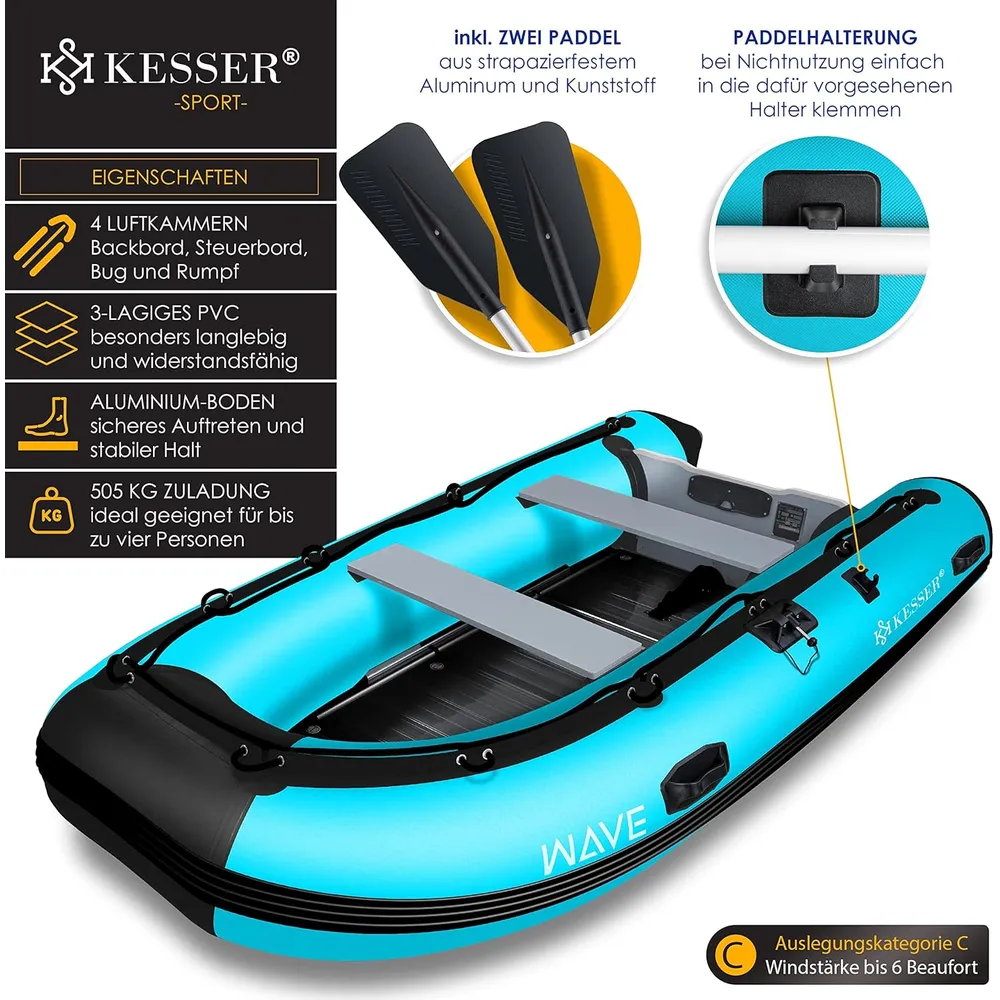 KESSER Wave aufblasbares Schlauchboot in Familiengröße bis 4 Personen mit 2 Sitzbänken, Paddeln, geeignet für Süß – und Salzwasser, Außenbordmotor bis 15 PS geeignet, Tasche und Tragegriffe für einfachen Transport inkl. Luftpumpe und Reparatur Kit.