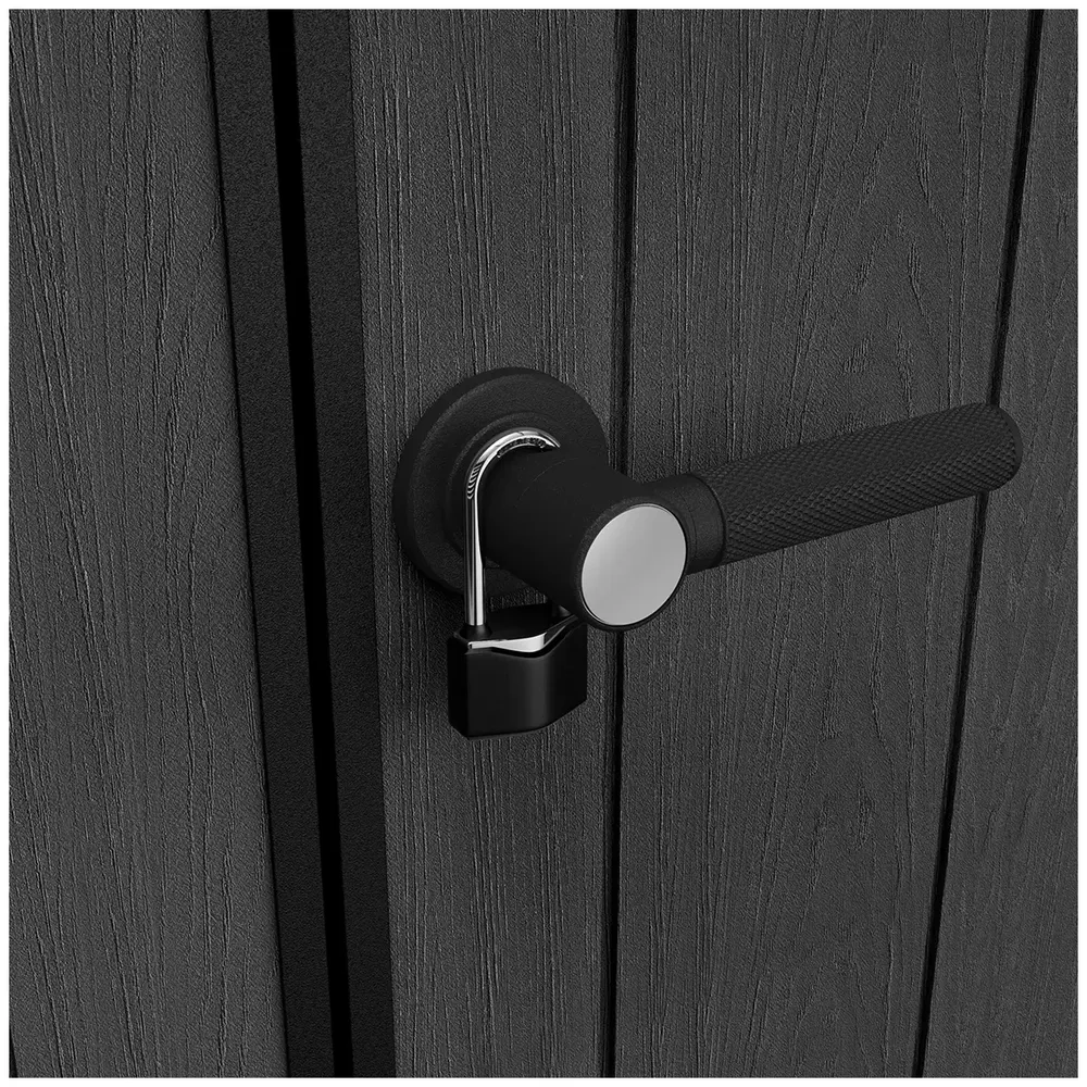 The Cortina 9 x 7 Shed is modern in every way. With a slanted roof above a band of windows, it boasts a sleek, contemporary design that stores your belongings in an eye-catching style. Its double-layered walls are made from Evotech, our innovative composite material that gives you the aesthetic look and feel of wood but with the benefits of resin. This extremely durable shed is completely weather resistant and maintenance free – it won’t rust, rot or peel. Add in features like steel reinforcements for extra strength, lockable double doors for security and convenience (lock not included), two-sided ventilation, a roof that can support a snow load of up to 150 kilograms, and a heavy-duty floor tough enough to support a riding mower, and you have a shed that works hard and looks great doing it.