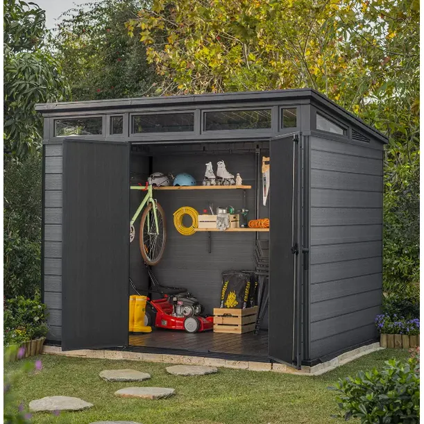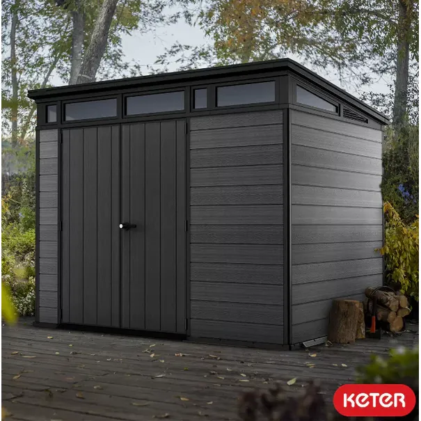 The Cortina 9ft 2″ x 7ft Shed is modern in every way. With a slanted roof above a band of windows, it boasts a sleek, contemporary design that stores your belongings in eye-catching style. Its double-layered walls are made from Evotech, an innovative composite material that gives you the aesthetic look and feel of wood but with the benefits of resin. This extremely durable shed is completely weather-resistant and maintenance-free – it won’t rust, rot or peel. Add in features like steel reinforcements for extra strength, lockable double doors for security and convenience (lock not included), 2-sided ventilation, a roof that can support a snow load of up to 150kg(330 lbs), and a heavy-duty floor tough enough to support a riding mower, and you have a shed that works hard and looks great doing it.