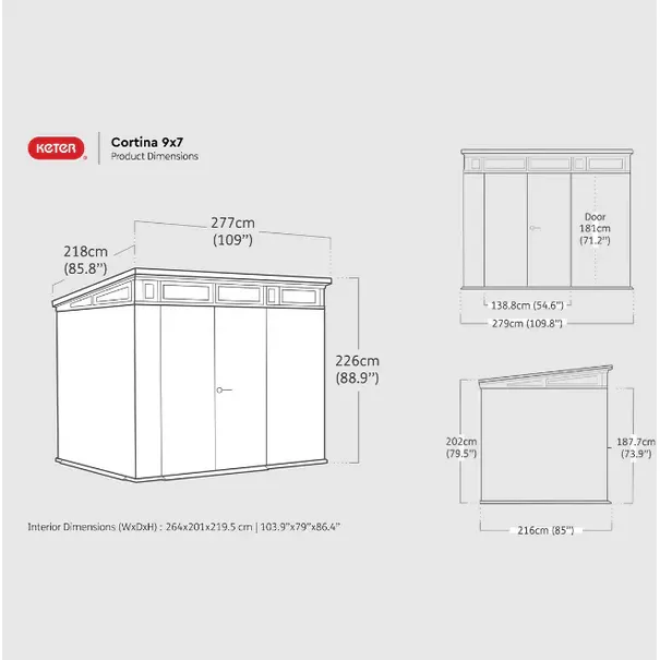 - Internal dimensions: H 219.5 x W 264 x D 201 cm