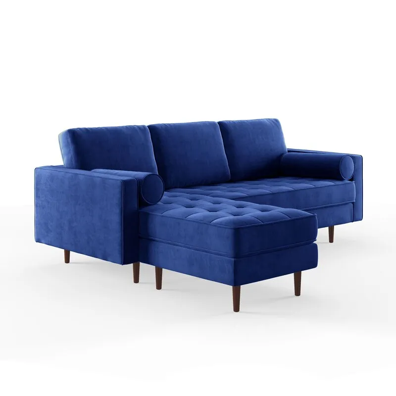 Incorporating classic lines with a streamlined silhouette, this reversible sectional sofa is the perfect combination of traditional design with a mid-century modern flair. Luxurious velvet upholstery provides an elegant look. A single-seat cushion with a modern block-style tufting and two comfortably designed back cushions are perfectly complemented by two round bolster pillows. The tapered walnut-stained conical legs provide ample support while adding style and sophistication. Its versatility is amazing. No longer do you have to choose. No longer do you have to pick a side. No longer are you tied down?