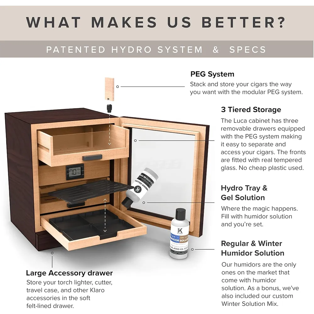 - CABINET-EXCLUSIVE ACCESSORY DRAWER – The Luca humidor cigar box features a large accessory drawer, the first-ever design on any cabinet-style humidor. Store your torch lighters, travel case, cigar cutters, and other accessories in this soft, felt-lined drawer. No more misplacing your cigar-smoking essentials.