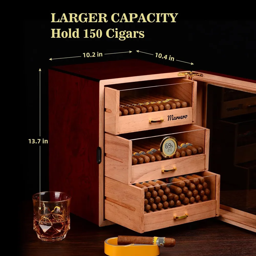 - 150-250 CAPACITY: The Cigar Humidors provides 3 movable cedar drawers with handles for up to 250 Cigars. Also the magnetic cedar-lined door makes the Humidors tightly sealed to keep your collections freshness and aroma