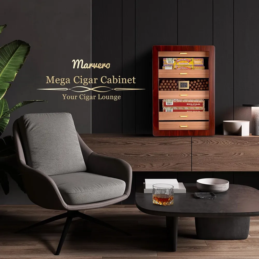 - MARVELOUS DESIGN: Marvero humidor crosses into new terrain by adapting Rounded cabinet design, Brown walnut drawer and double side gold-plated hardware. These improvements make our humidor unique in the market