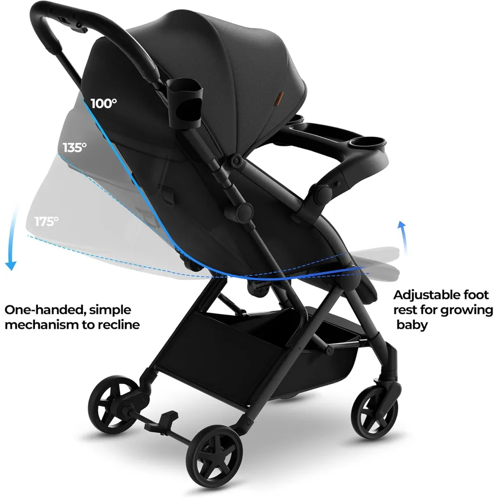 - 175° NEAR-FLAT RECLINE – Fully reclining backrest and adjustable footrest providing a lie flat mode that is perfect for newborns. 3-Position reclining backrest with easy one-hand adjustment.