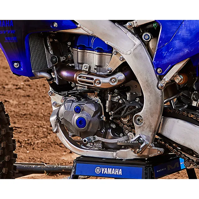 Featuring a reversed cylinder head layout, forged aluminum piston, titanium valves, lightened crank assembly and dry sump lubrication, the 2024 YZ450F’s advanced DOHC four-stroke engine is light, compact and world renowned for its incredibly broad pulling power across the entire rev range.