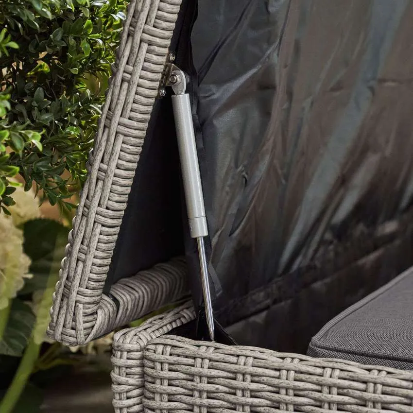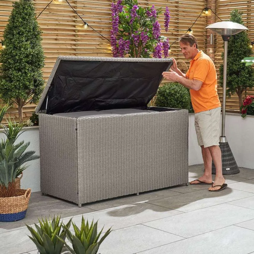 Description Large Rattan Storage Box-165cm (64.9″) x 80cm (31.5″) 95cm (37.4) (WxDxH) The Nova – Heritage White Wash Cushion Storage Box is perfect for storing your cushions and other garden accessories when not in use. This large storage box offers plenty of room to store your rattan furniture cushions inside or to tidy away children’s toys. This storage box has a solid protective top and woven rattan sides, so it perfectly fits in your other garden furniture sets and keeps your accessories free from dirt and dust. The Storage Box has hydraulic arms which allows the lid to stay open when in use, meaning you can easily put your items inside without the risk of getting your fingers trapped or fighting with a lid that wants to close. This Nova Cushion Storage Box is made from a powder coated aluminium frame that can endure even the worst weather. The rattan fabric is designed to be long lasting and is UV protected to ensure the grey colour remains without fading. The storage box can keep items protected during light rain showers and high winds, thanks to the inner lining. The box is not fully waterproof so we recommend storing cushions indoors, if it rains, to minimise the risk of damage or to place the storage box in a sheltered area.