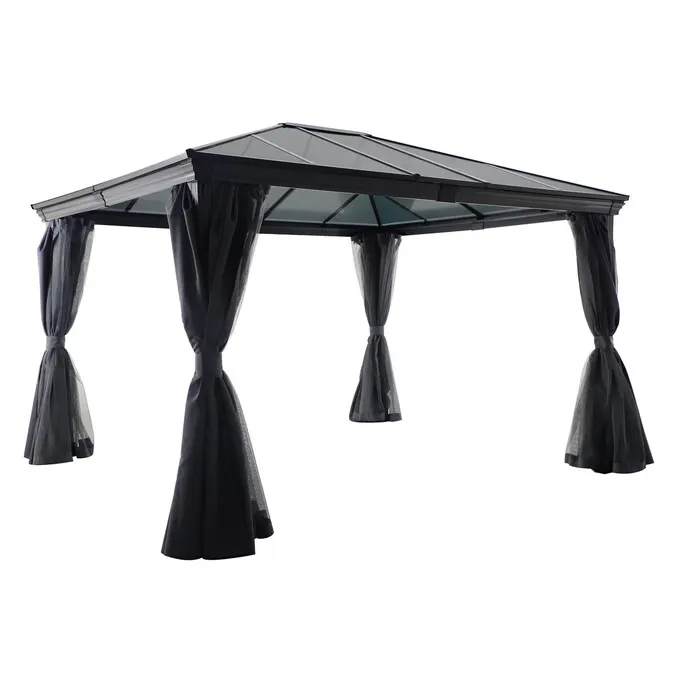 Este cenador de jardín está equipado con cuatro cortinas de poliéster que protegen del sol y de la vista. Si los mosquitos le invaden nada más caer la noche, dispone también de cuatro mosquiteras para protegerse.