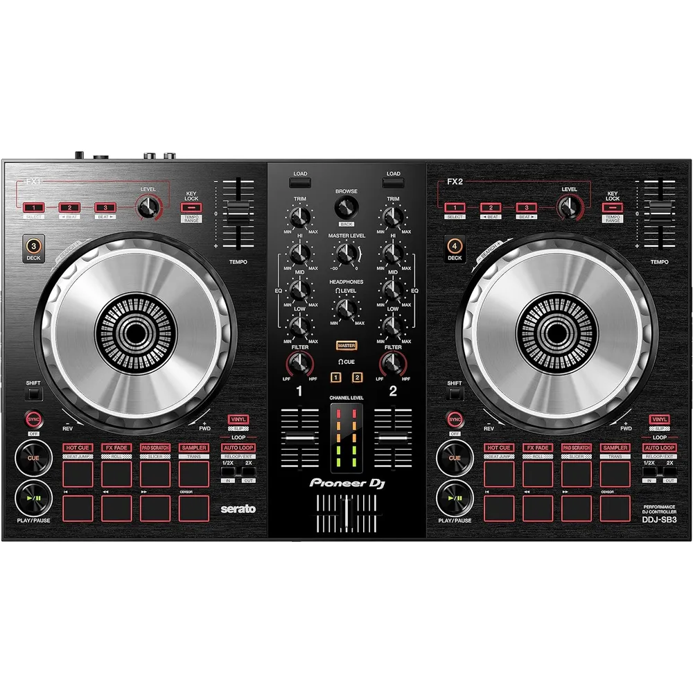 The DDJ-SB3 is constructed from premium materials and audio circuitry. Its robust build ensures durability, while the distinctive styling and aluminium jog wheel deliver a professional feel.